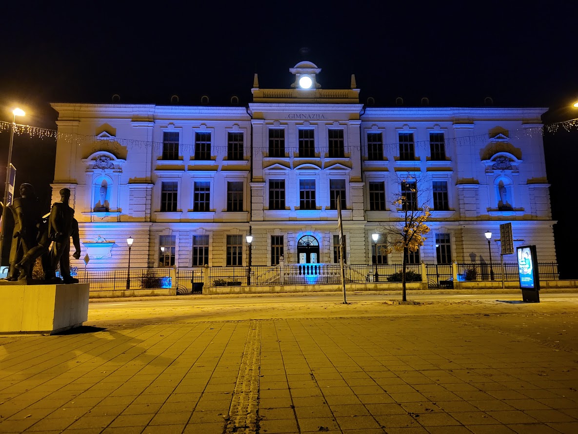 Gimnazija Kranj osvetljena z modro barvo ob dnevu sladkorne bolezni 14.november 2023